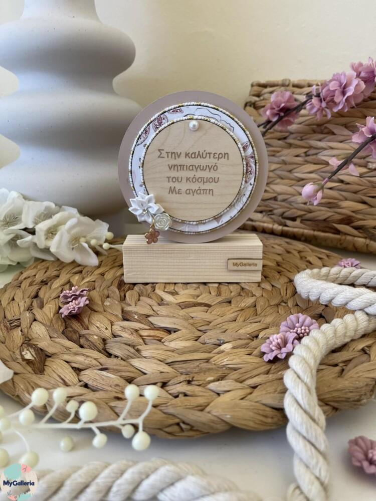Χειροποίητο επικαθήμενο διακοσμητικό σε απόχρωση πούδρα με ξύλινη φιγούρα”Στην καλύτερη δασκάλα του κόσμου, με αγάπη”