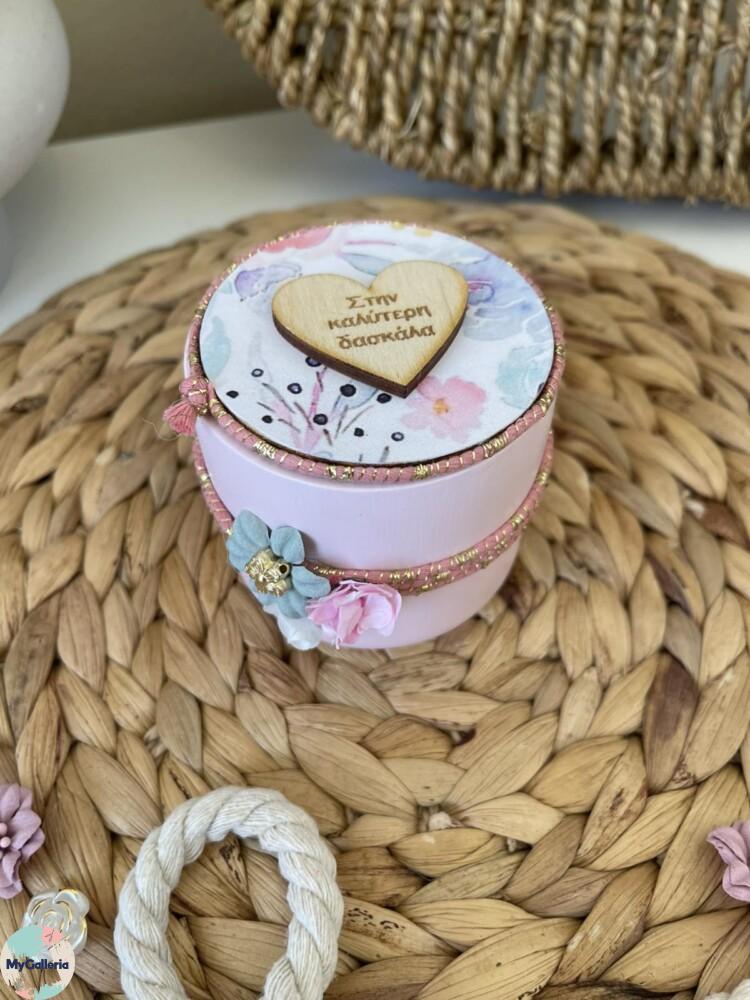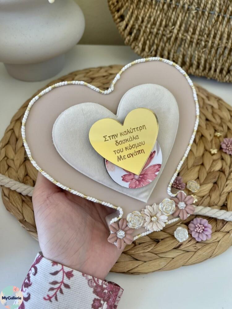 Χειροποίητο διακοσμητικό αρωματικό κεράκι σε πούδρα απόχρωση με ξύλινη φιγούρα καρδιά ” Στην καλύτερη δασκάλα ”