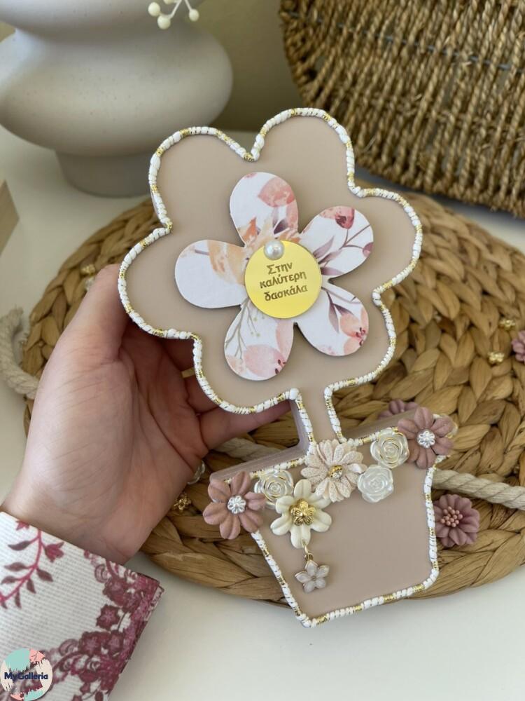 Χειροποίητο επικαθήμενο διακοσμητικό μήλο σε πούδρα απόχρωση με ξύλινη φιγούρα ” Στην καλύτερη δασκάλα ”