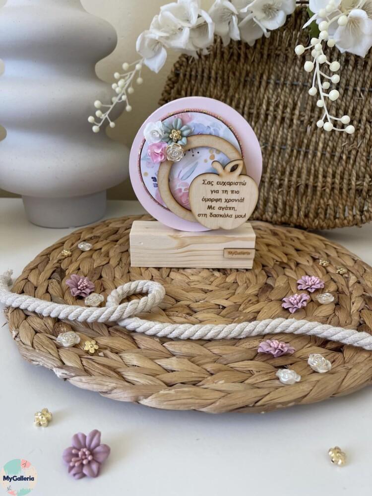 Χειροποίητο επικαθήμενο διακοσμητικό καρδιά σε ροζ απόχρωση με ξύλινη φιγούρα”Στην καλύτερη δασκάλα ”
