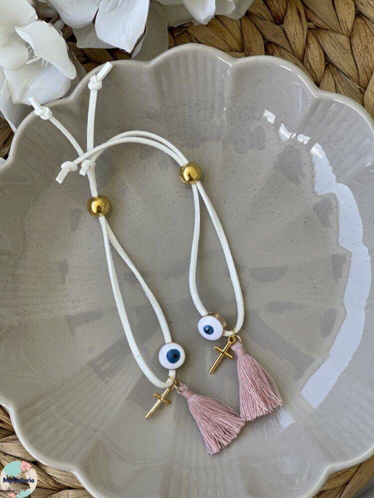 Μαρτυρικό βραχιόλι με λευκό σουέντ κορδόνι , χάντρες ,υφασμάτινη φούντα , σταυρό και μεταλλικό μάτι