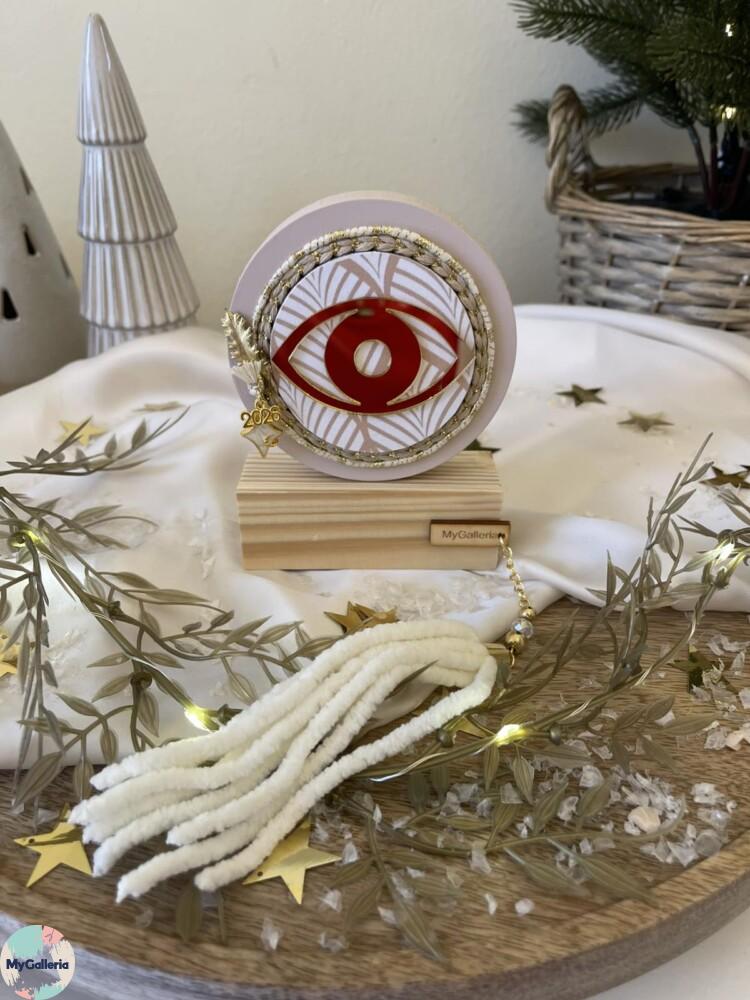 Υλικά: ξύλινο διακοσμητικό , οικολογικά χρώματα, τεχνική με φύλλα χρυσού, βελούδινεσ κορδέλες , μεταλλικά στοιχεία