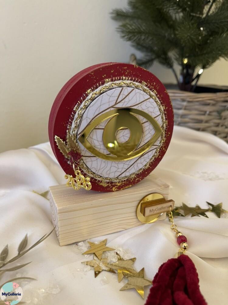 Υλικά: ξύλινο διακοσμητικό ,  οικολογικά χρώματα, τεχνική με φύλλα χρυσού, βελούδινεσ κορδέλες , μεταλλικά στοιχεία