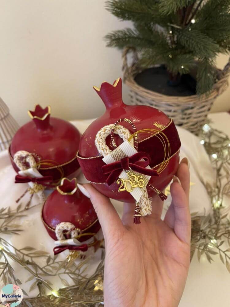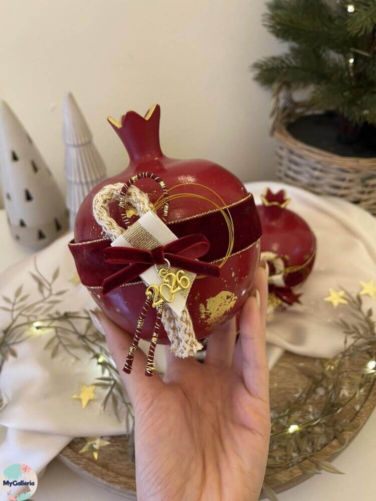 Χειροποίητο διακοσμητικό κεραμικό ρόδι με φύλλα χρυσού