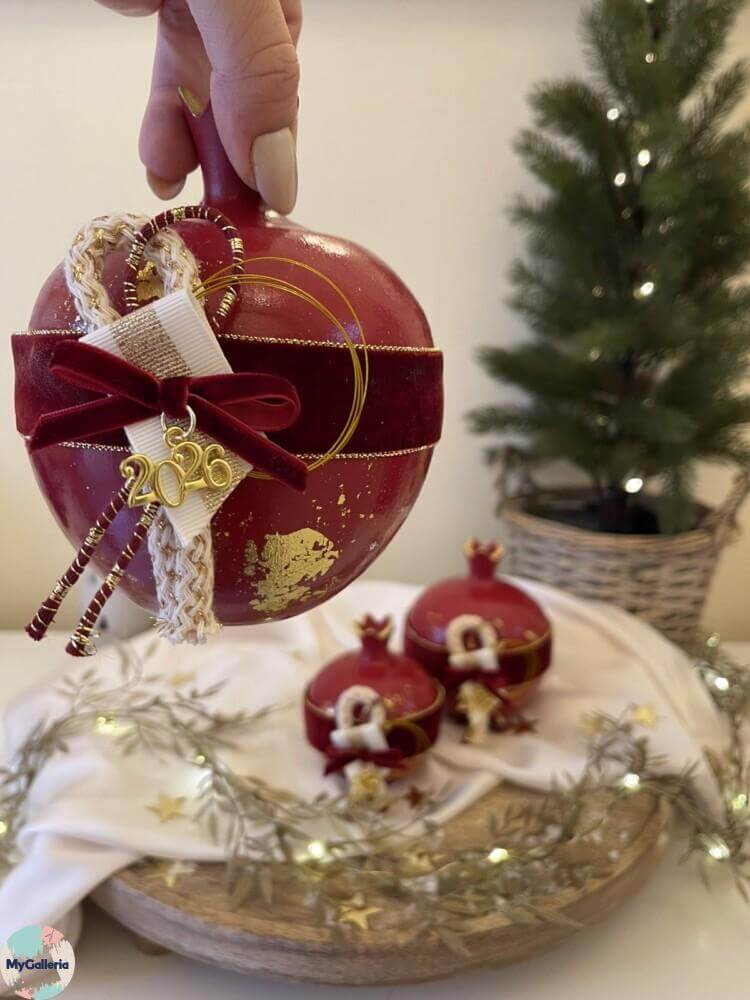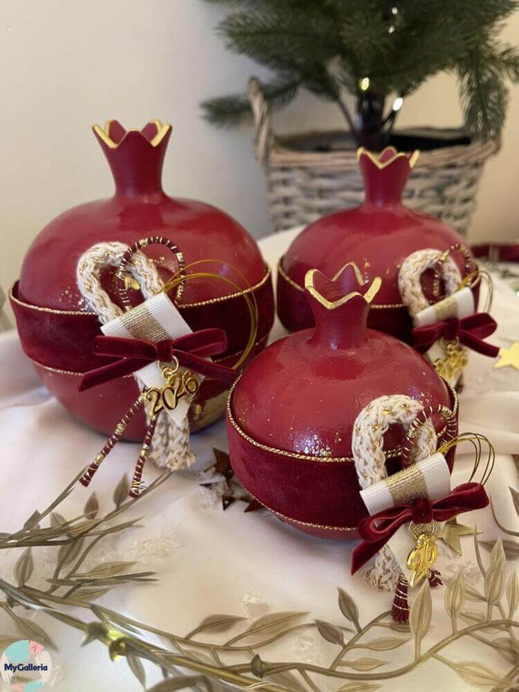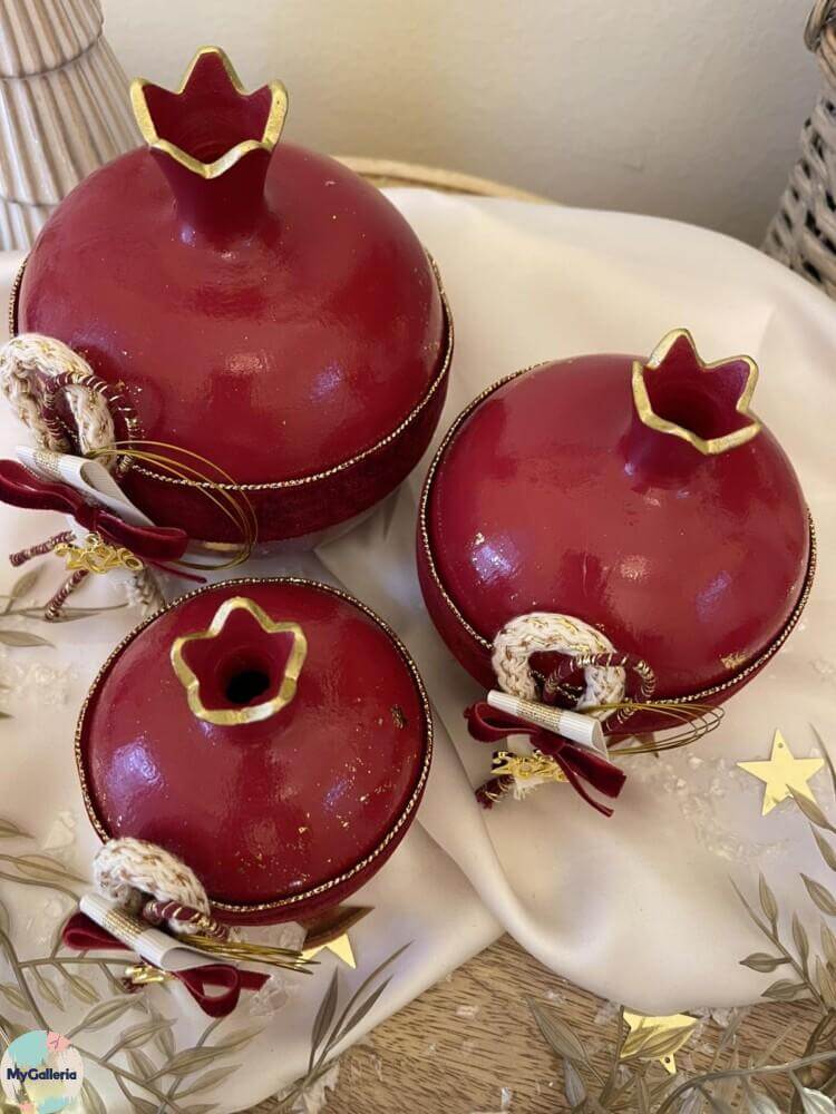 Υλικά: κεραμικό ρόδι, οικολογικά χρώματα, τεχνική με φύλλα χρυσού, βελούδινεσ κορδέλες , μεταλλικά στοιχεία
