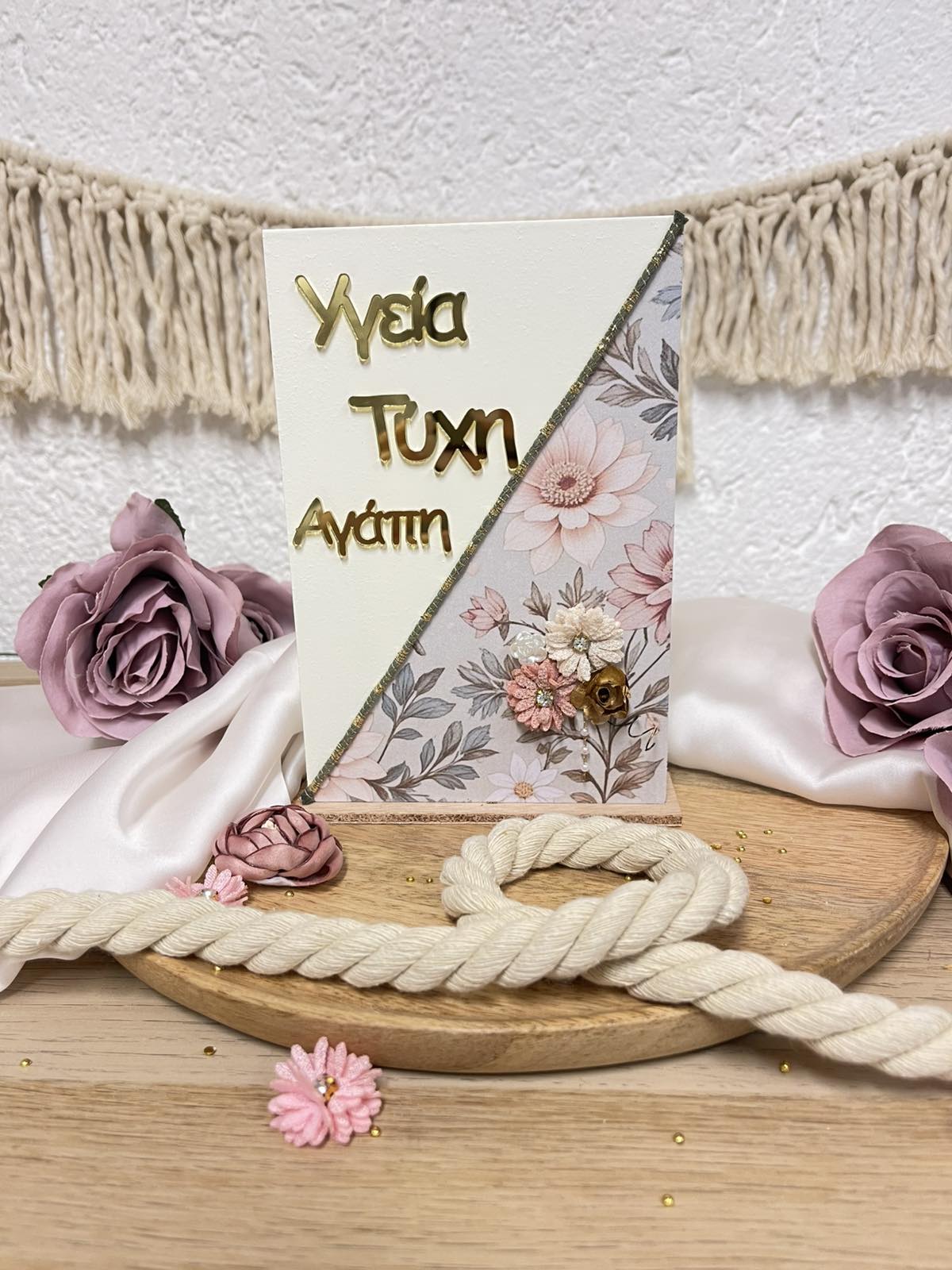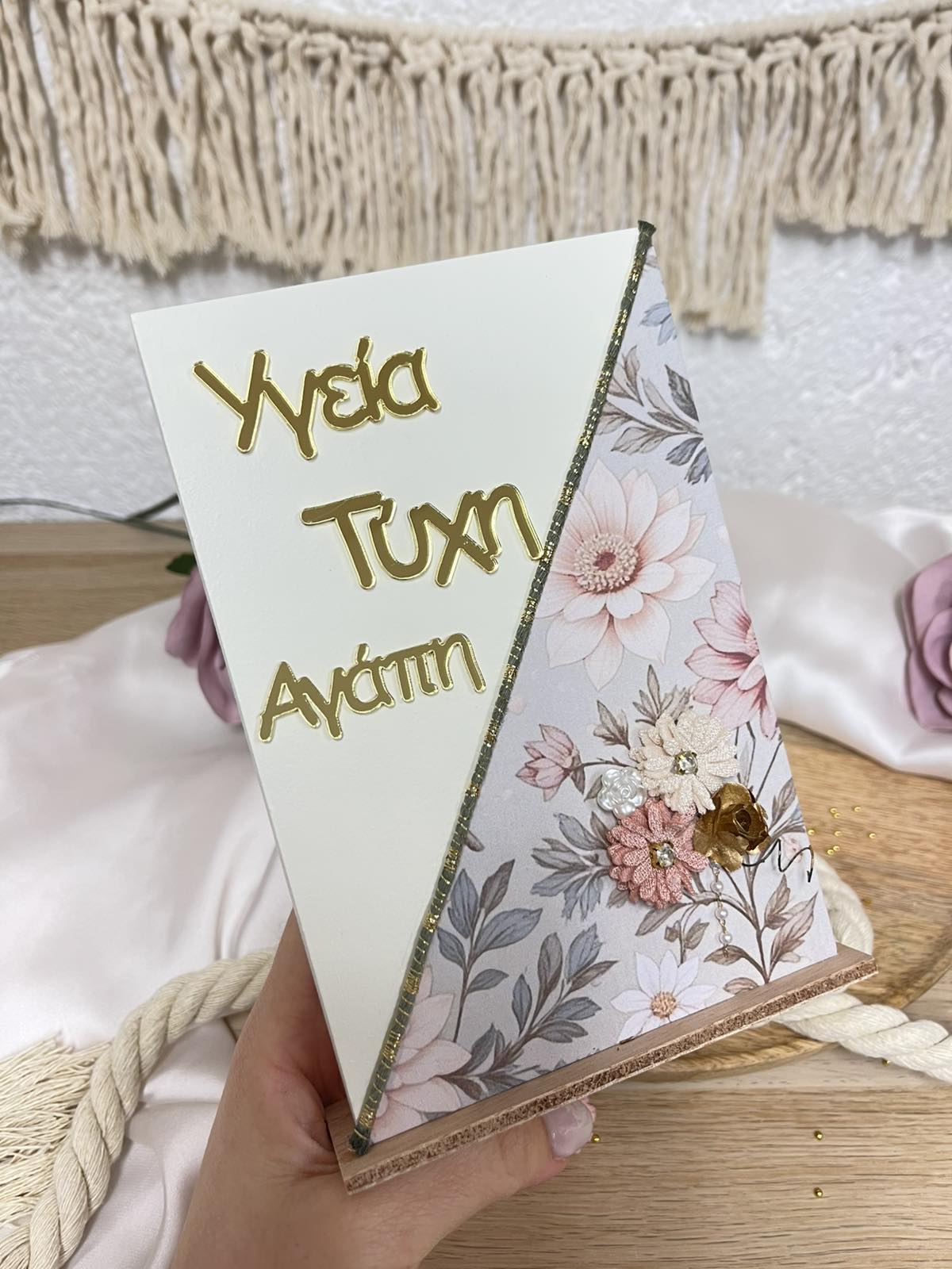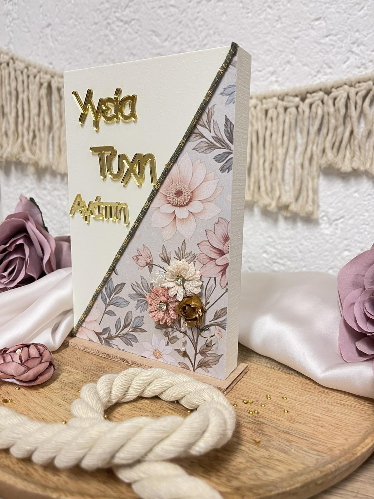 Χειροποίητο  επικαθήμενο διακοσμητικό σε ζαχαρί απόχρωση με plexiglass ευχές
